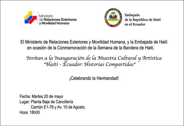 Invitamos a inauguración de muestra cultural "Haití - Ecuador: Historias Compartidas" Hoy 18h00 en @CancilleriaEcpic.twitter.com/1CU43q2VzR