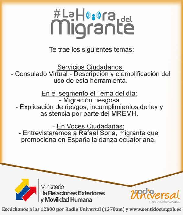 Hoy #LaHoradelMigrante te trae en sus temas: #NoMigraciónRiesgosa #ConsuladoVirtual a las 12h00 por @SentidoSurpic.twitter.com/eWZiN7UPUP