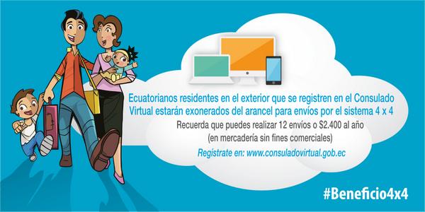 Sistema 4×4 exonera a ecuatorianos residentes en el exterior del pago del arancel de $42 @MaLandazuri #Beneficio4x4pic.twitter.com/hkePONilns