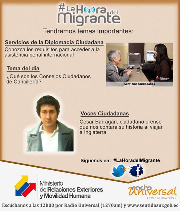 Te invitamos a escuchar hoy a las 12h00 tu programa #LaHoradelMigrante por http://sentidosur.gob.ec pic.twitter.com/deW75HUBOF