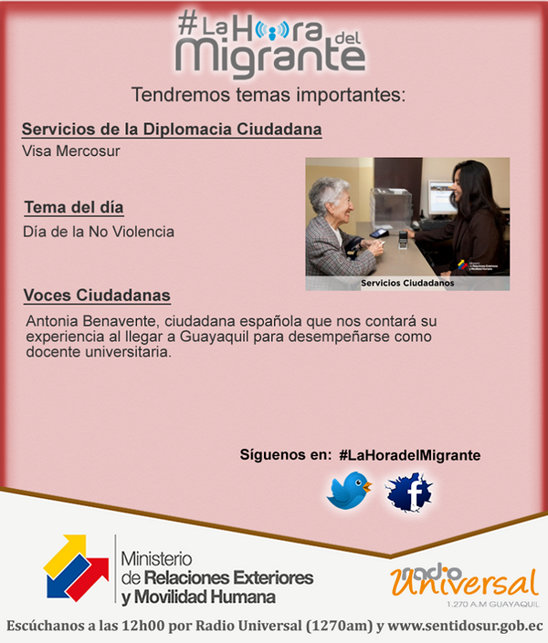 Escucha en estos instantes tu programa #LaHoradelMigrante y los temas que te traemos por: http://sentidosur.gob.ec pic.twitter.com/fJBMkvp3oX