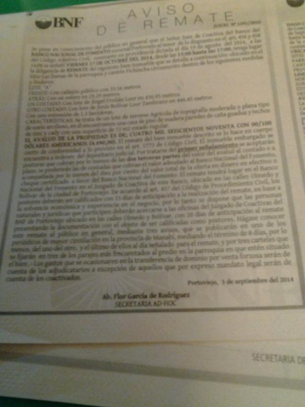 @CancilleriaEc @RicardoPatinoEC @CaracolRadio ESTA E UNA MUESTRA D LOS MILES AVISO D REMATE Q SE HACEN E EL PAISpic.twitter.com/utTkWAFOqb