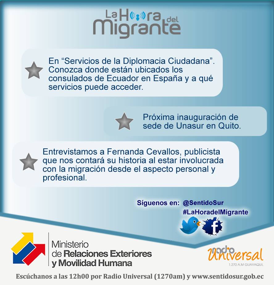 Hoy en #LaHoradelMigrante te contamos sobre los servicios de consulados de Ecuador en #España http://sentidosur.gob.ec pic.twitter.com/TnsBuVaOj5