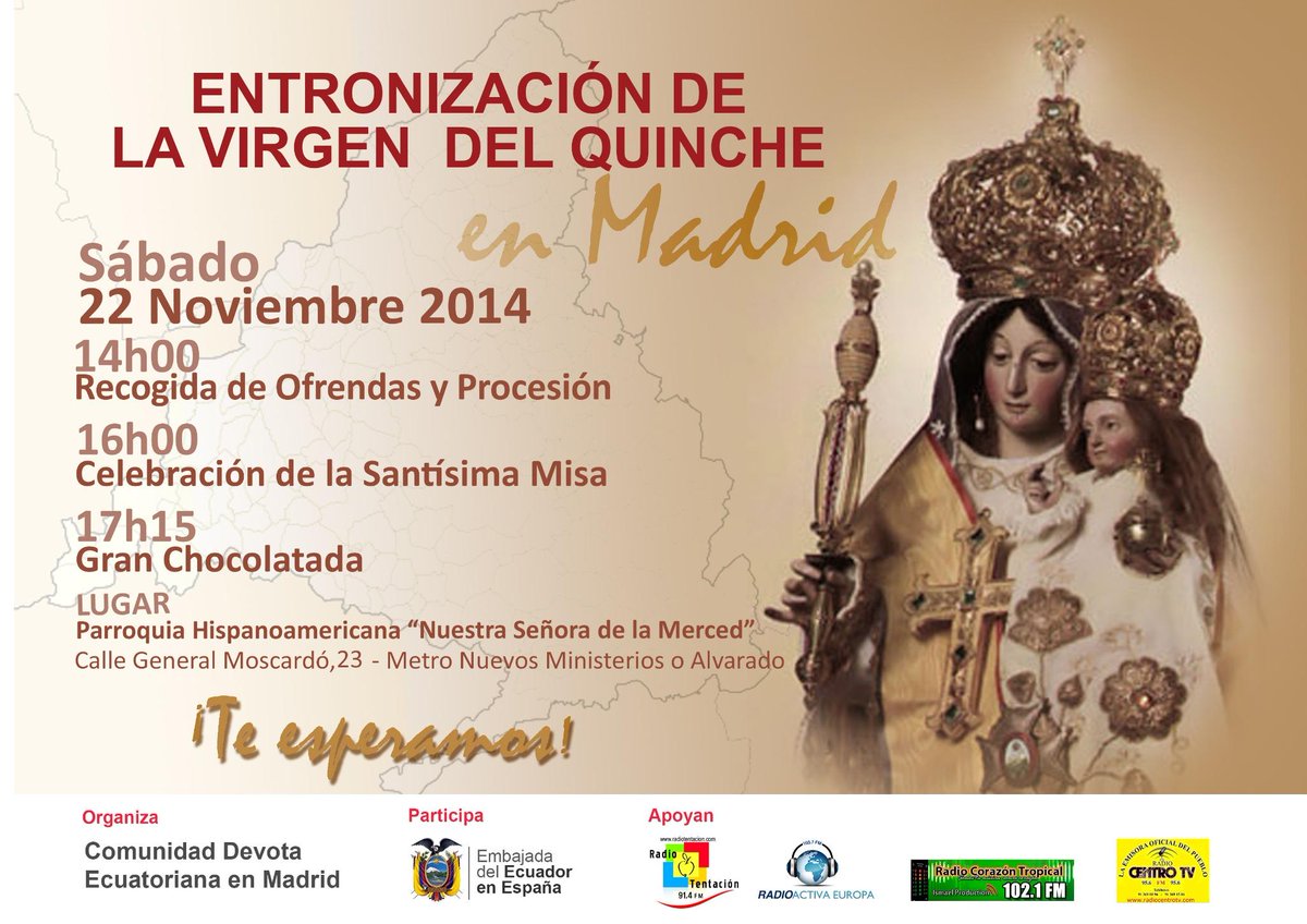 Embajada de Ecuador en #España participa en entronización de la Virgen del Quinche en #Madrid @EmbajadaEcuESPpic.twitter.com/LNMEDYbCEL