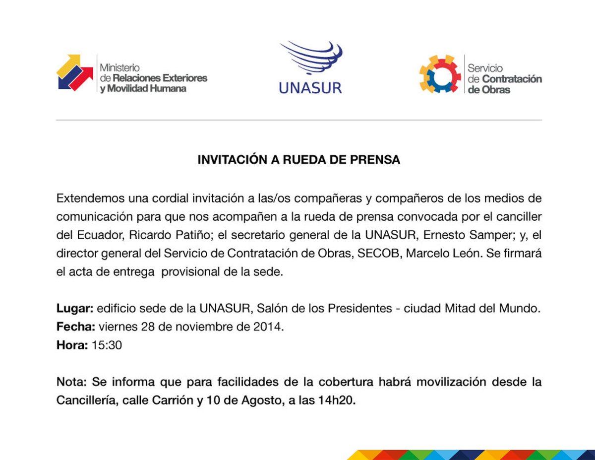 Este viernes 28 , 15h30 en edificio de #UNASUR, rueda de prensa de @RicardoPatinoEC @ernestosamperp y @Marceleonecpic.twitter.com/zSGtKqFOTi