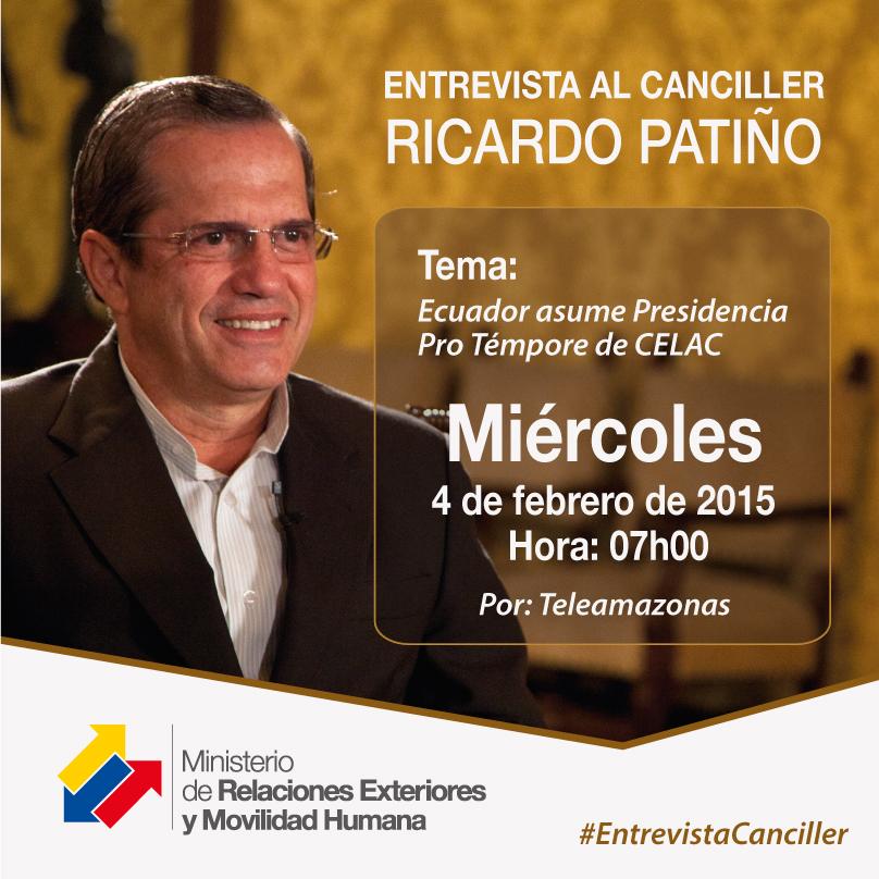 Canciller @RicardoPatinoEC ofrecerá entrevista HOY a las 07h00 por @teleamazonasec Tema: #CelacEcuadorpic.twitter.com/b8E8lWxDmK
