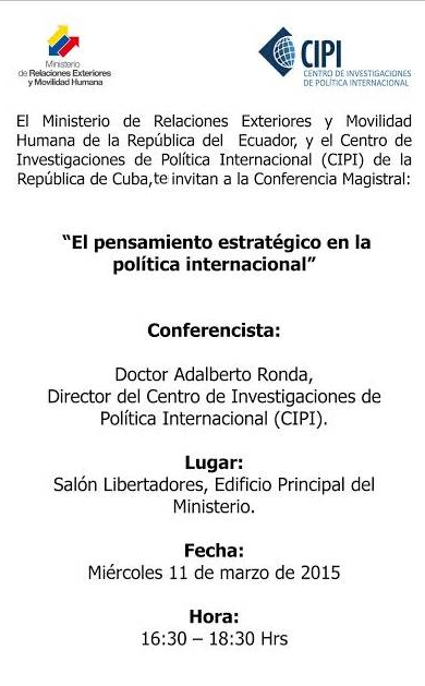 Te invitamos a la conferencia "El Pensamiento Estratégico en la Política Internacional" Hoy 16h30 en @CancilleriaEcpic.twitter.com/dUtD7aAVOO