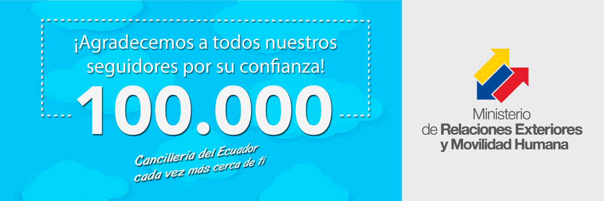 "@CancilleriaEc: ¡Gracias a ustedes ya somos 100.000. Agradecemos a todos y cada uno de nuestros seguidores por su confianza! http://t.c