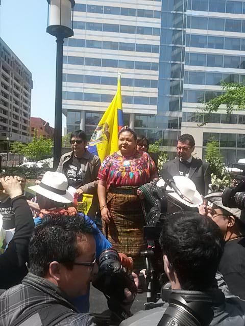 Acaba de arribar Premio Nobel, Rigoberta Menchú a las afueras del Banco Mundial #WeDeserveJusticepic.twitter.com/ic9mDKIfVI