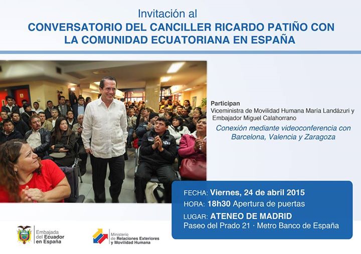 Canciller @RicardoPatinoEC mantendrá encuentro con la comunidad ecuatoriana en #Madrid, Mañana 19h00 #EcuadorContigopic.twitter.com/YQKSPS0n5w