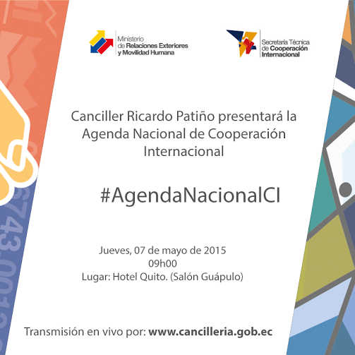 Canciller @RicardoPatinoEC junto a @SETECI presentará Agenda Nacional de Cooperación Internacional. Mañana, 09h00pic.twitter.com/sPj0nJYR8I