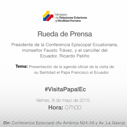 Rueda de prensa sobre Agenda Oficial de la Visita del Papa a Ecuador #VisitaPapalEc Mañana 7h00 Conferencia Episcopalpic.twitter.com/zGsGPPgVSy