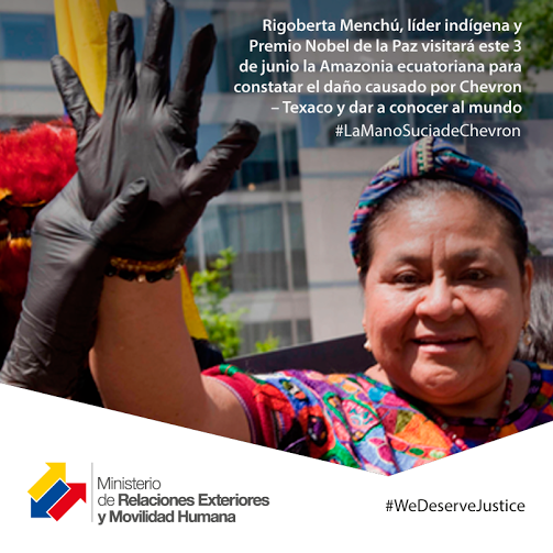 Rigoberta Menchú, Premio Nobel de la Paz,constatará zona afectada por Chevron-Texaco en Lago Agrio, este 3 de juniopic.twitter.com/s1DaJDaOzM