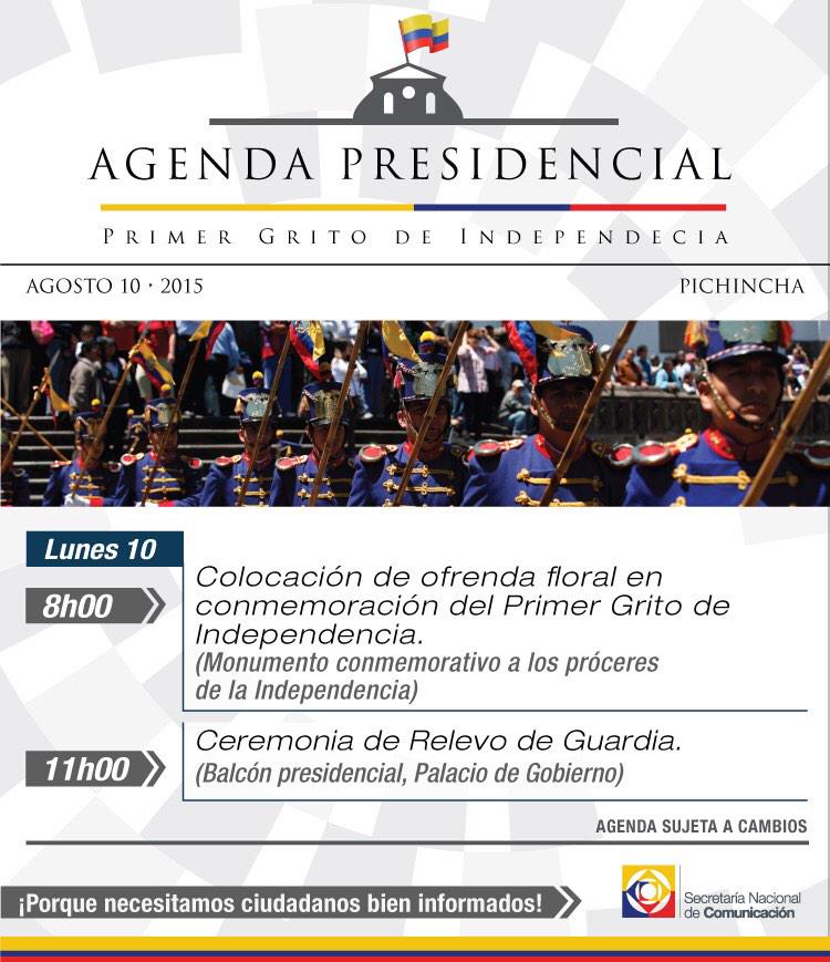 Compartimos la agenda que cumplirá hoy el Presidente @MashiRafael en #Quito #10deAgosto #EcuadorNoParapic.twitter.com/JJFuLFEygi