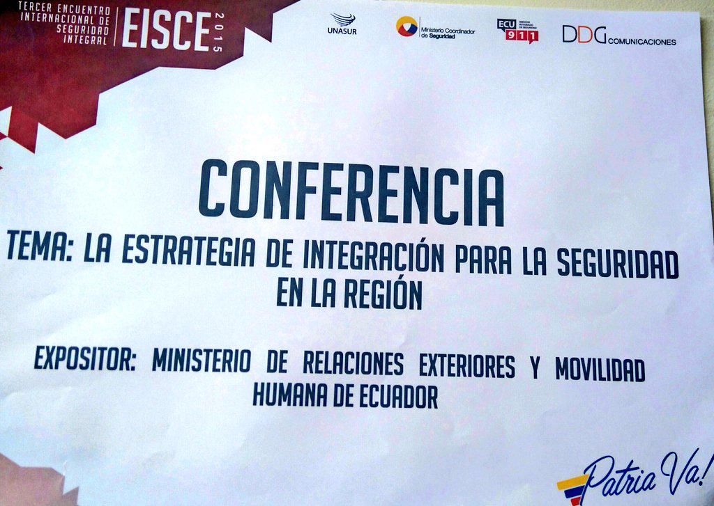 En el marco del #EISCE2015 Canciller @RicardoPatinoEC ofrecerá en instantes conferencia sobre seguridad en la regiónpic.twitter.com/WDX6gMgEQ9