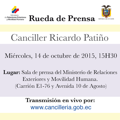 Canciller @RicardoPatinoEC ofrecerá rueda de prensa. Hoy 15h30. Tema: #Assange #EnViVo por: http://cancilleria.gob.ec pic.twitter.com/qlNcs21jiP