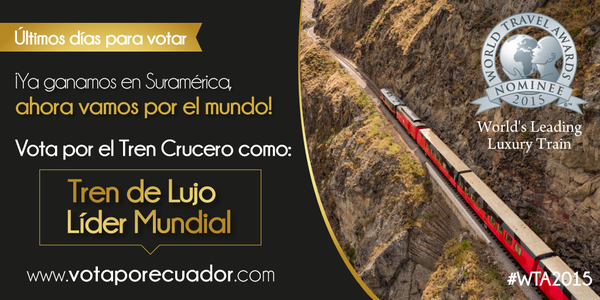 ¡Últimos días! Vota por @TrenEcuador categoría "Tren de Lujo Mundial" en: http://votaporecuador.com/ #WTA2015pic.twitter.com/Uv8Anhw90l