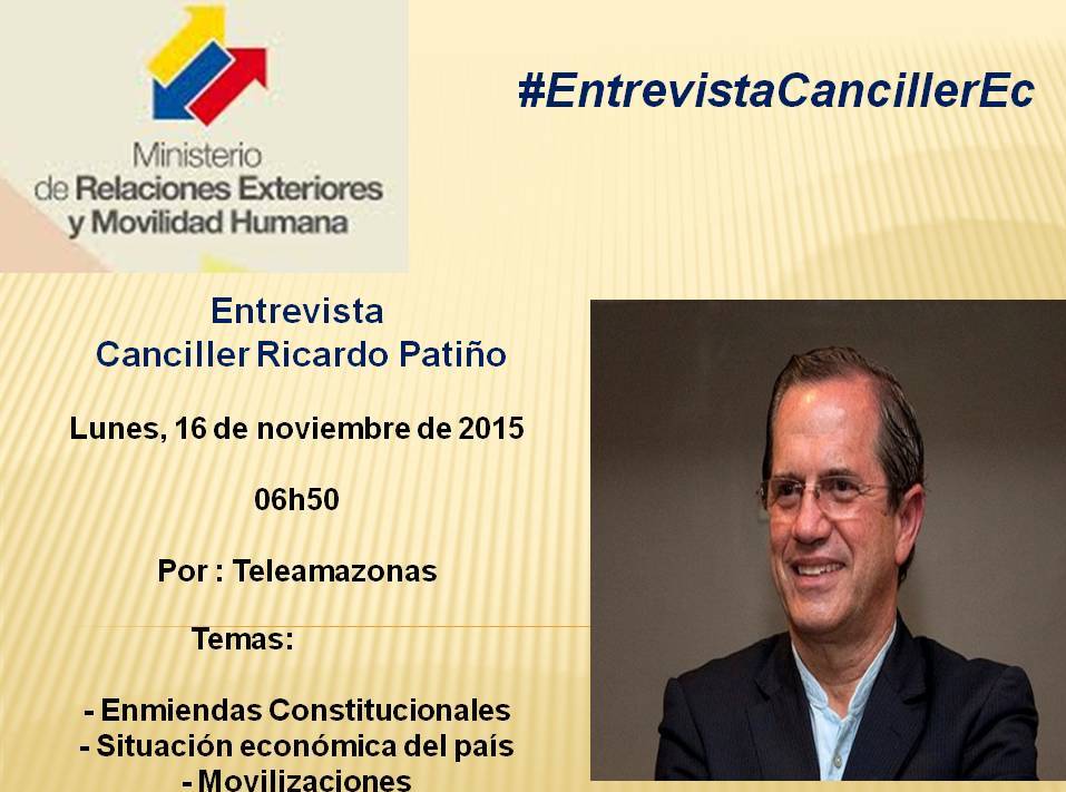 Lunes 16 ➔ entrevista al Canciller @RicardoPatinoEC a las 6h50 por @teleamazonasec Tema: #EnmiendasConstitucionalespic.twitter.com/qkRIXE97gw