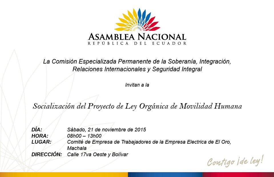 Socialización del proyecto de #LeydeMovilidadHumana en #ElOro, este sábado de 8h00 a 13h00.https://twitter.com/doraaguirre/status/667015381610012674 …