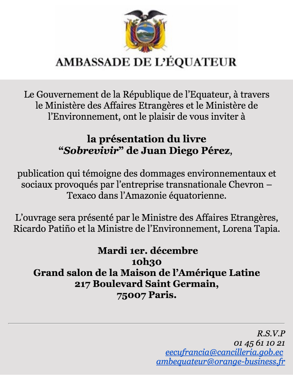 Presentación del libro #SOBREVIVIR en #París sobre la contaminación de #Chevrón-Texaco en Ecuador en @EmbajadaEcuFRAhttps://twitter.com/EmbajadaEcuFRA/status/671368060863934465 …