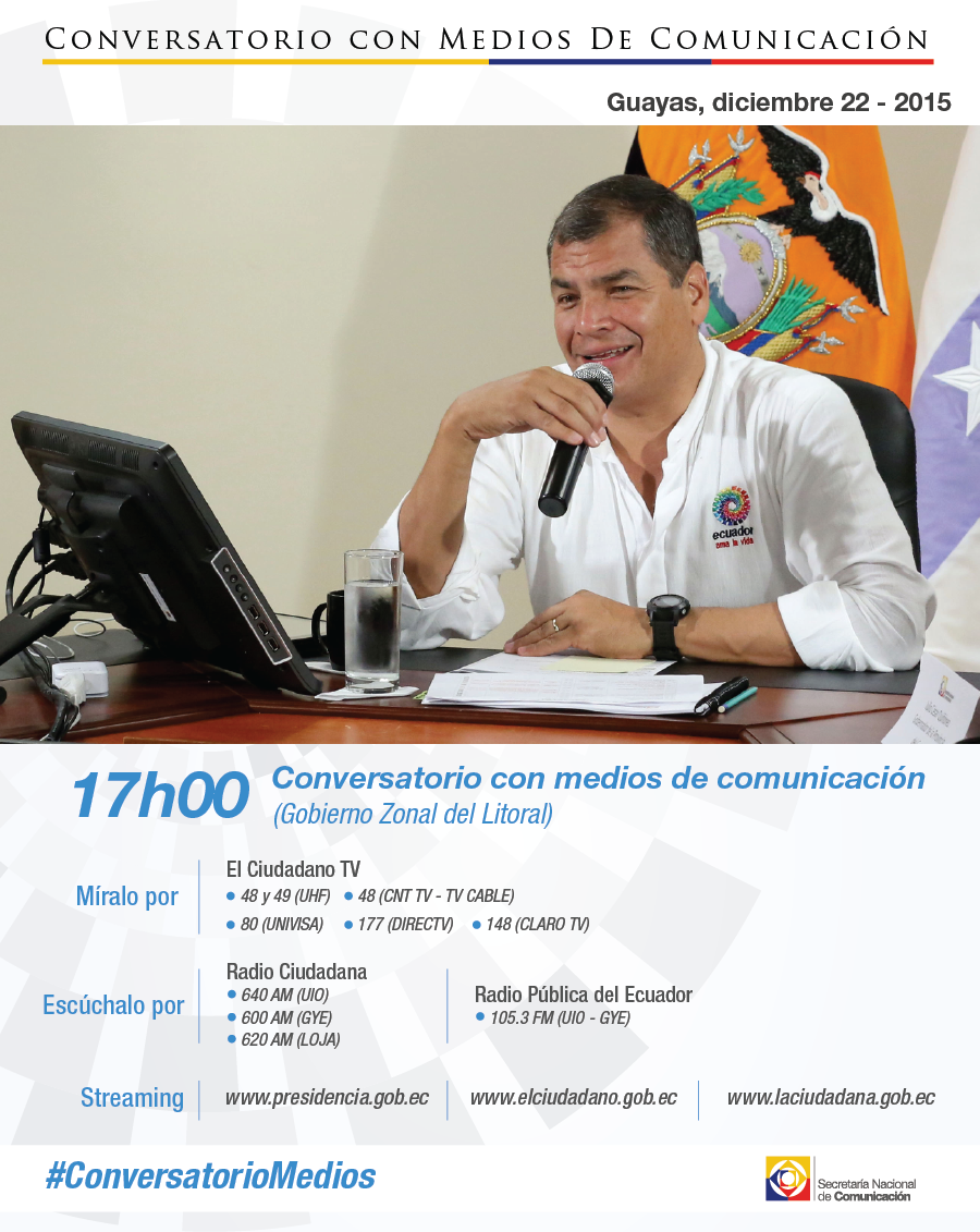 17h00, ¡No se pierda! #ConversatorioMedios junto al Pdte. @MashiRafael desde #Guayas por: http://www.presidencia.gob.ec/  pic.twitter.com/wzvcvZqJKC
