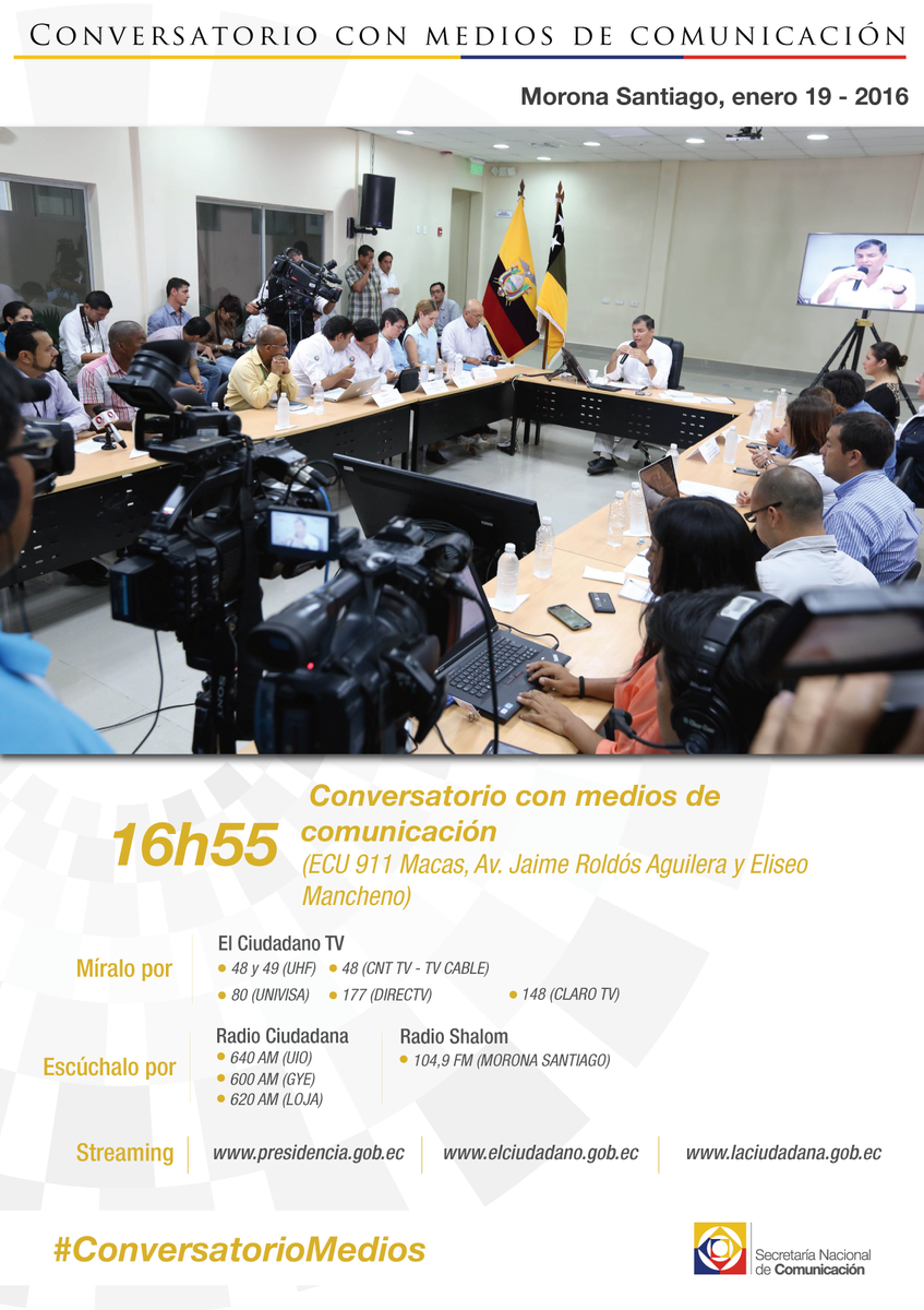 Hoy 16h55, siga en vivo el #ConversatorioMedios junto al Presidente @MashiRafael por: http://www.presidencia.gob.ec https://twitter.com/ComunicacionEc/status/689565622385115136 …