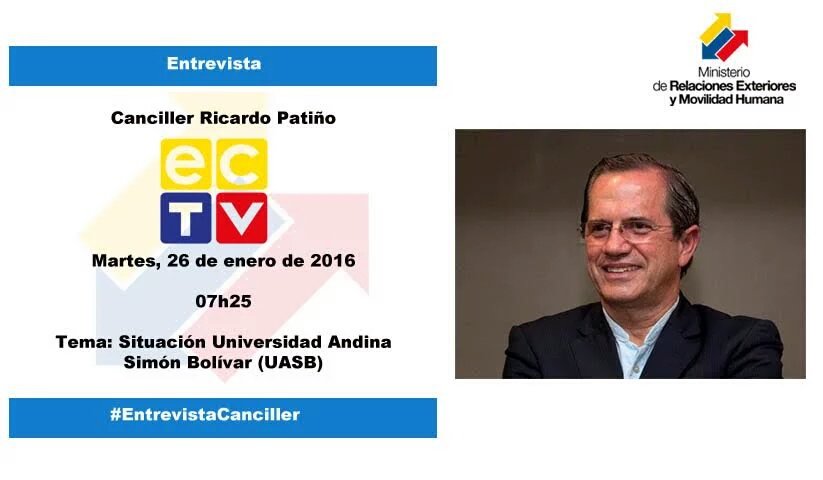 En instantes entrevista a Canciller @RicardoPatinoEC en @EcuadorTV. Tema: situación Universidad Andina Simón Bolívarpic.twitter.com/H3WoLgUBUR