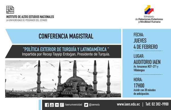 Presidente de #Turquía ofrecerá conferencia magistral en @IAENEDU. Jueves, 4 de febrero - 17h #VisitaOficialTurquíapic.twitter.com/D3ECLe8qVy