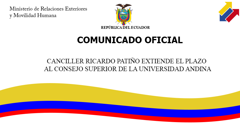 Canciller @RicardoPatinoEC extiende el plazo al Consejo Superior de la Universidad Andina: http://goo.gl/p3Sw9B pic.twitter.com/eBFaX0IeWw