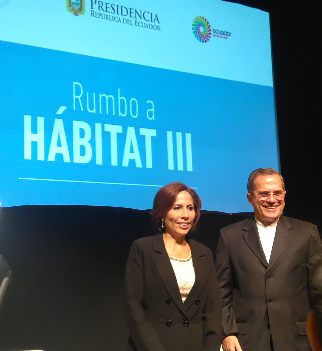 Canciller @RicardoPatinoEC junto a Ministra Ma. Angeles Duarte presentes para iniciar presentación #habitatIIIQuitopic.twitter.com/FFBbg3aGW5