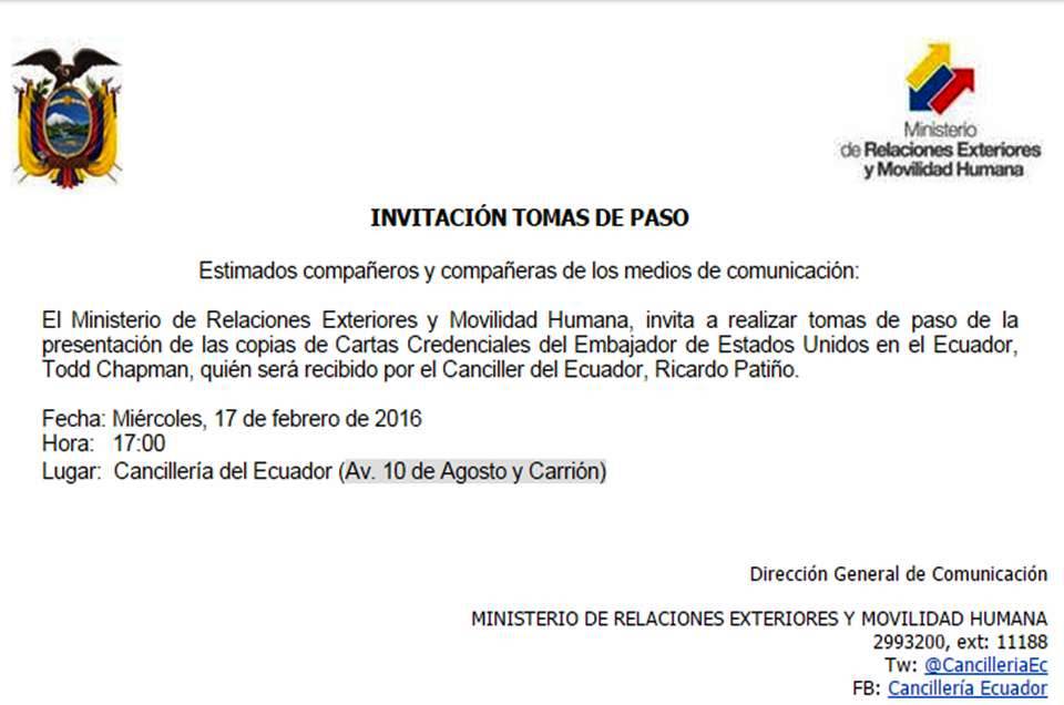 Embajador de #EEUU en Ecuador realizará hoy presentación de copias de #CartasCredenciales ➨ 17h00 en @CancilleriaEcpic.twitter.com/mbyjw1mtAx