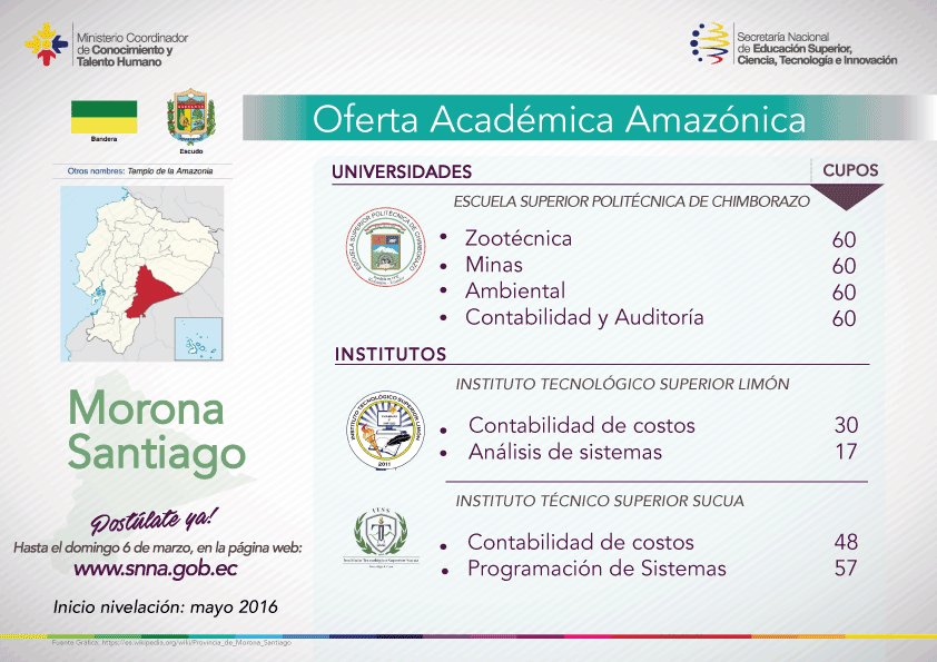 Conoce la #OfertaAcadémica Amazónica, entra a: http://goo.gl/6cOvJc y postula en http://www.snna.gob.ec https://twitter.com/ConocimientoEc/status/705418238138695680 …