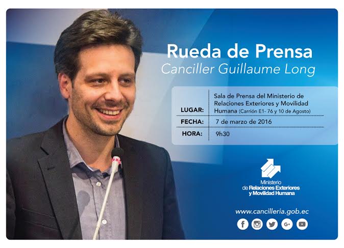 Canciller ecuatoriano @GuillaumeLong ofrecerá rueda de prensa. Hoy, lunes 7 de marzo, a las 9h30 en @CancilleriaEcpic.twitter.com/CQTaBpGqNs