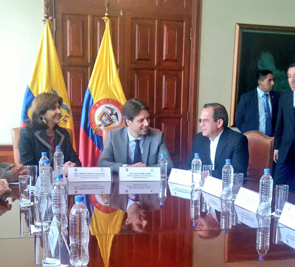 Canciller @GuillaumeLong y Ministro @RicardoPatinoEC se reúnen con Canciller de #Colombia María Ángela Holguín.pic.twitter.com/CcdoCQLVkV