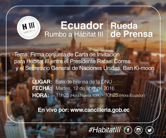 Rueda de prensa entre Pdte. @MashiRafael y Secretario General de ONU #BanKiMoon sobre #HabitatIII en #Quito ➞ 10h25pic.twitter.com/coCWP3fxGi
