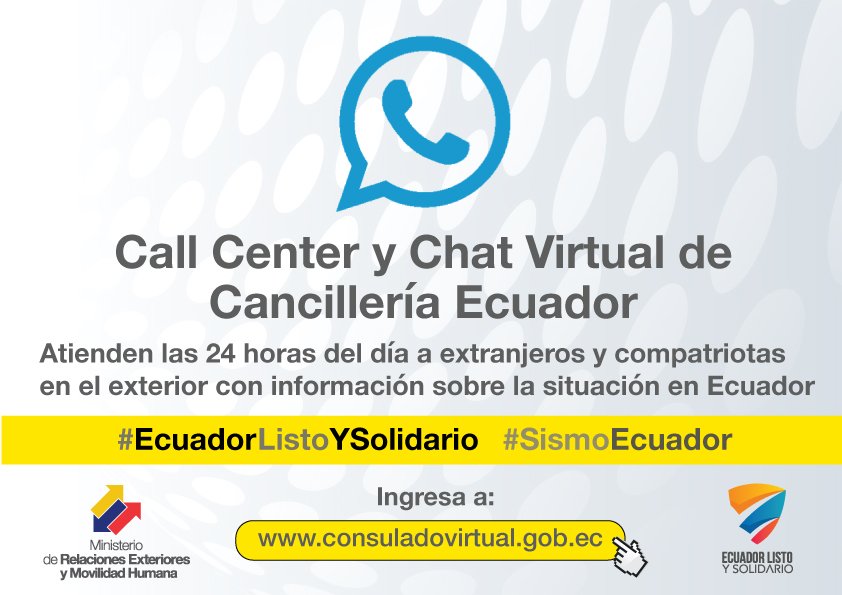 Si estás en el exterior puedes comunicarte a las líneas o al chat virtual de atención permanente #TodosPorEcuadorpic.twitter.com/DnEw00Aqn4