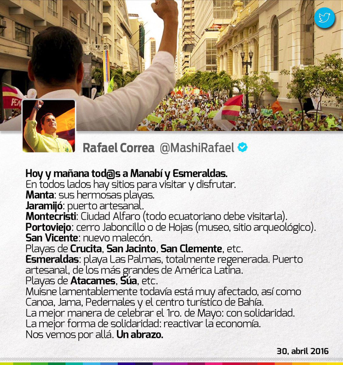 "Hoy y mañana, tod@s a #Manabí y #Esmeraldas. En todos lados hay sitios para visitar" @MashiRafael #UnidosSomosMáshttps://twitter.com/TurismoEc/status/726424681440534528 …