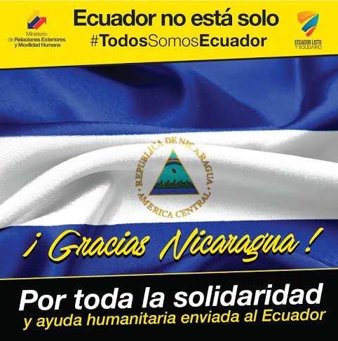 Agradecemos a #Nicaragua por toda la cooperación y solidaridad con #Ecuador #TodosSomosEcuadorpic.twitter.com/JNWHgxy9KY