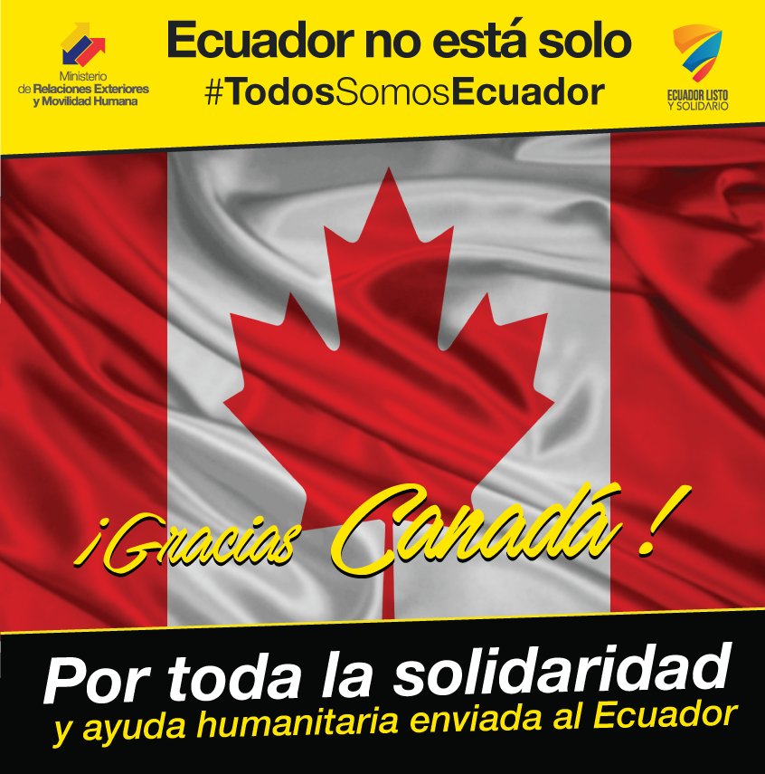Agradecemos la ayuda humanitaria y la gran solidaridad de #Canadá con nuestro país #TodosSomosEcuadorpic.twitter.com/eue0Pk0Nb7