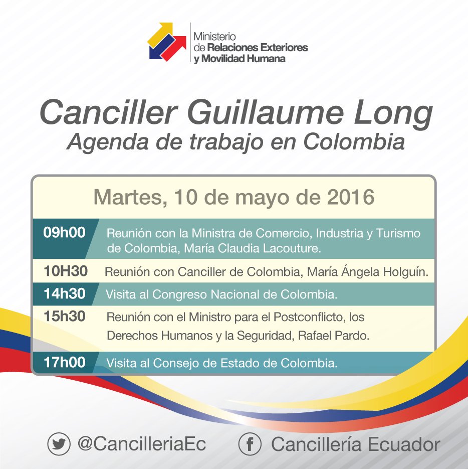 Compartimos la agenda de trabajo que cumplirá el Canciller del #Ecuador @GuillaumeLong mañana en #Colombiapic.twitter.com/cmIqnq77nW