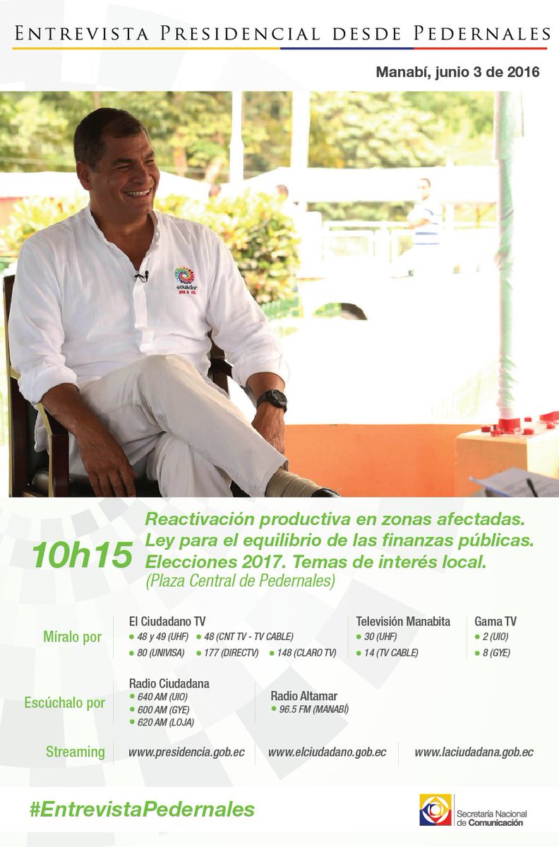 #EnVivo siga en este momento la entrevista al Presidente @MashiRafael desde #Pedernales #EntrevistaPedernaleshttps://twitter.com/ComunicacionEc/status/738746695568199680 …