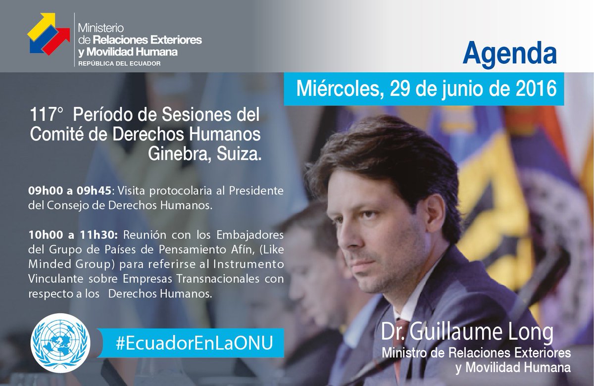 Compartimos la agenda que cumplirá el Canciller @GuillaumeLong mañana en el marco de #EcuadorEnLaONU en #Ginebrapic.twitter.com/w3sEtSX4Bb