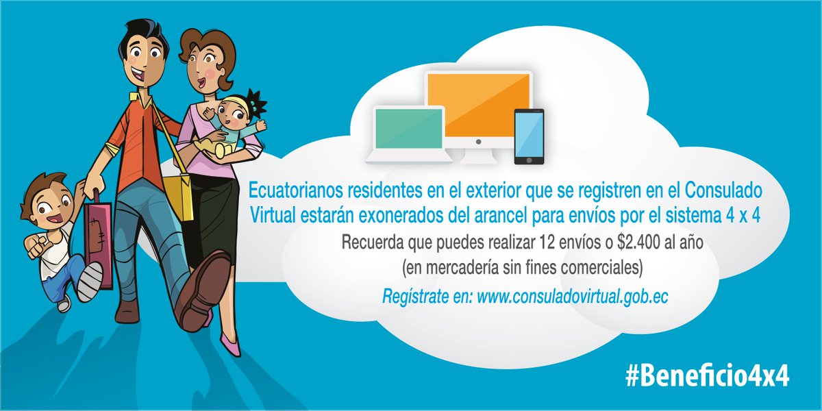 Compatriota regístrate en el #ConsuladoVirtual para acceder al #Beneficio4x4 a la hora de enviar paquetes a Ecuadorpic.twitter.com/u9KzMmKcrm