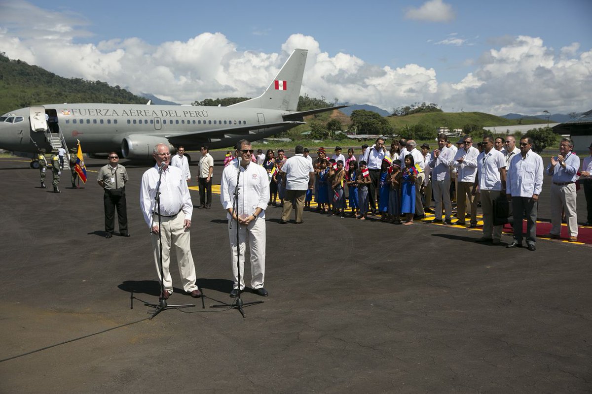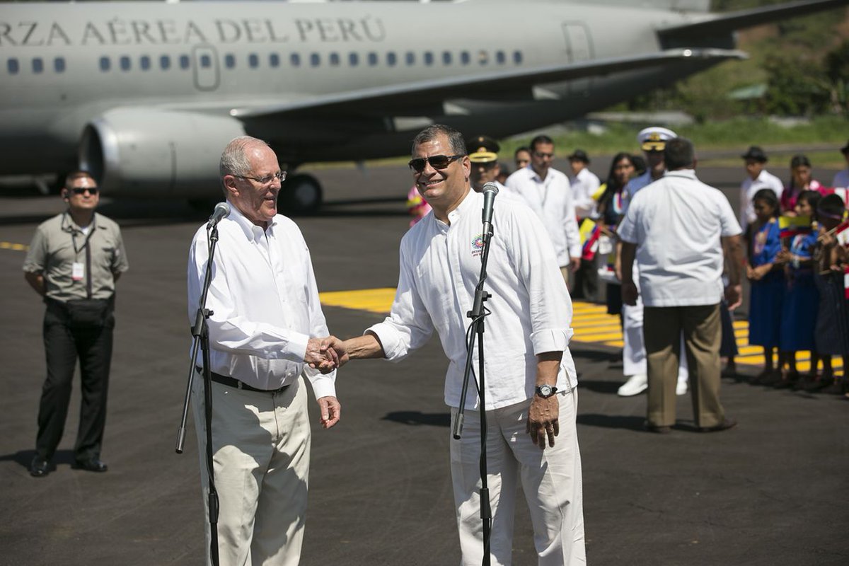 FOTOS| El Presidente @MashiRafael recibió a su par de Perú @ppkamigo en Macas para participar del #GabineteBinacionalpic.twitter.com/aZcAJ8JytE