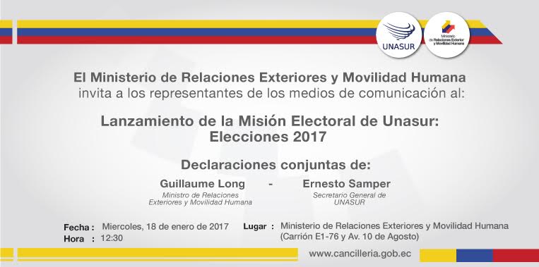 Hoy - 12h30 | Lanzamiento de Misión Electoral de @unasur en #Ecuador con el Canciller @GuillaumeLong y @ernestosamperp #UnasurEleccionesECpic.twitter.com/rFtRCapNtN