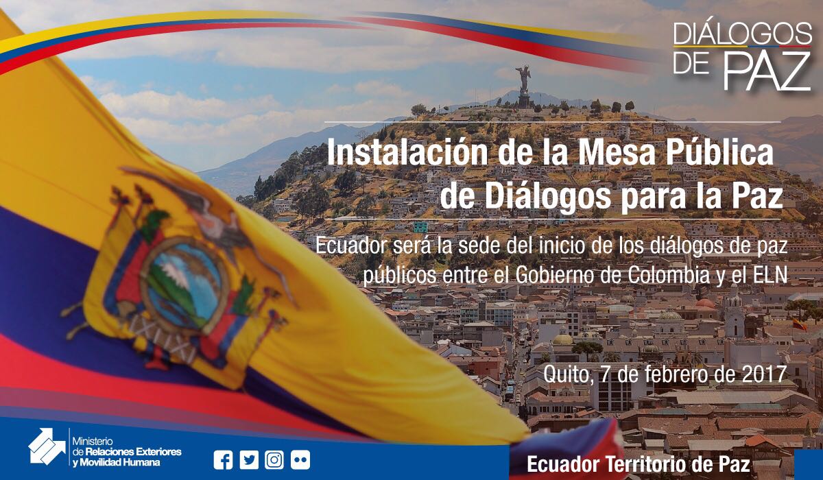 #Ecuador acompaña los #DiálogosDePaz entre Gobierno de #Colombia y el #ELN. Hoy se instala en #Quito la Mesa Pública de los Diálogos de Paz.pic.twitter.com/XEq1X8aaBA