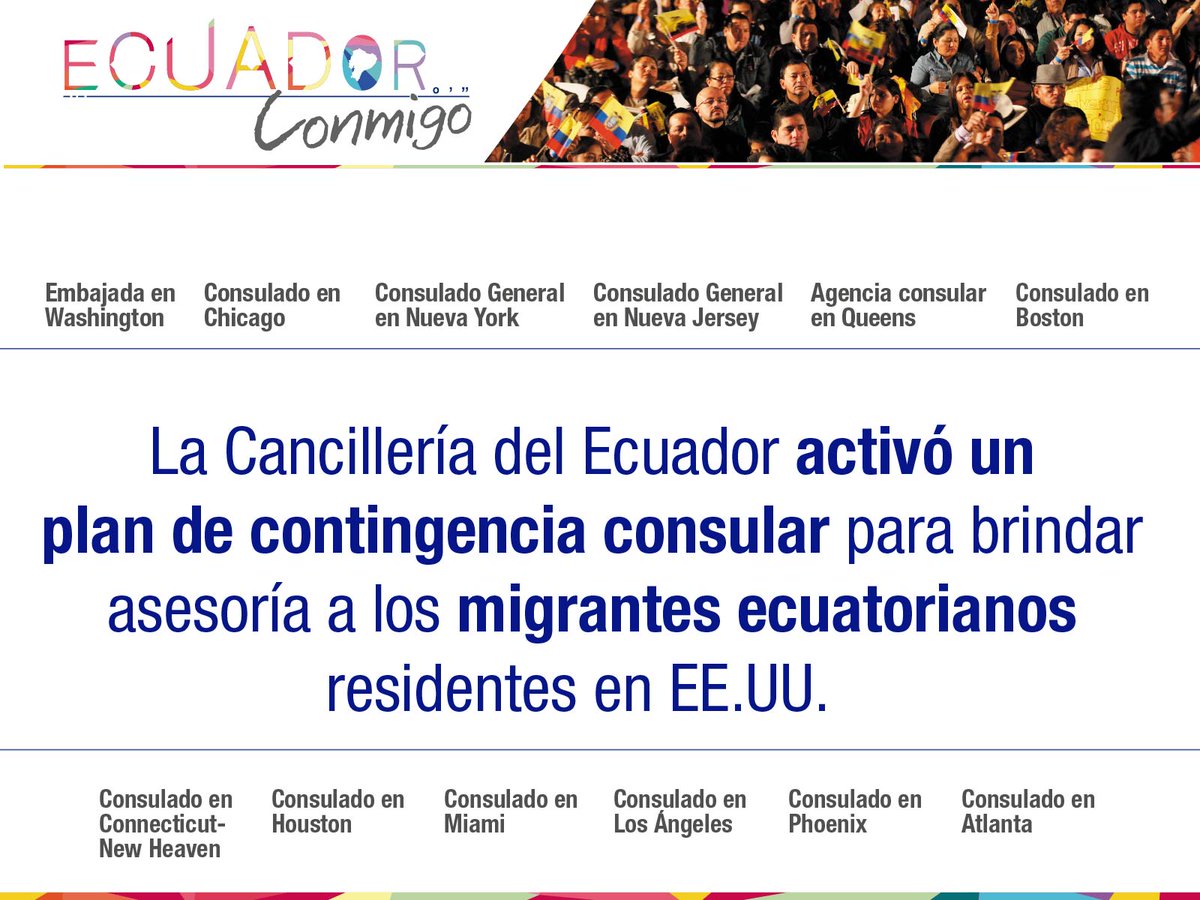 #EcuadorConmigo | @CancilleriaEc activó un plan de contingencia consular para brindar asesoría a los migrantes ecuatorianos en EE.UU.pic.twitter.com/CIsEIXomES