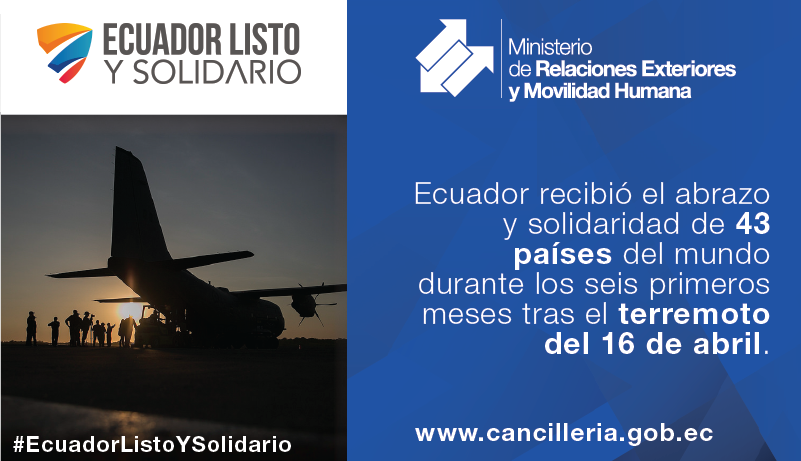 #Ecuador recibió la solidaridad de 43 países, durante los primeros 6 meses después del terremoto del #16A ¡Gracias! #EcuadorListoYSolidariopic.twitter.com/qdnZtHGLAn