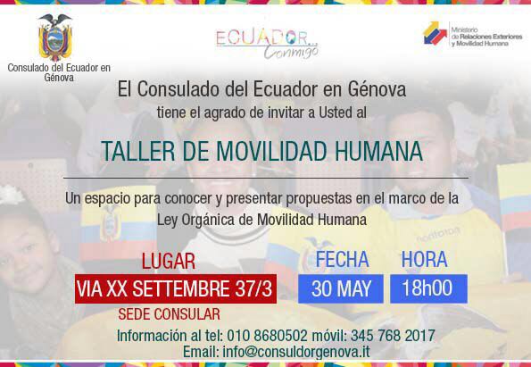 Ecuatorianos en Génova: El @consuldorgenova te invita al taller sobre la Ley de Movilidad Humana. Martes, 30 de mayo - 18h00 #EcuadorConmigohttps://twitter.com/consuldorgenova/status/869248225072619520 …