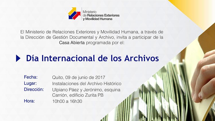 Con motivo del #DíaInternacionalDeLosArchivos la @CancilleriaEc te invita a visitar su casa abierta. Hoy, de 10h00 a 16h30. ¡Te esperamos!pic.twitter.com/fkfNUZB3Js
